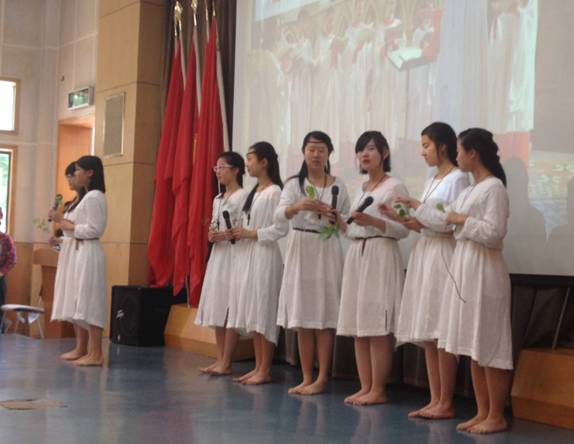 五个班的表演形式与风格因为各自主题的不同相互间有较大的差异,这使得活动全程充满了乐趣与新意,平时看起来“高冷”异常的外文诗歌,此刻竟丝毫不令人感到厌烦。比如我们班抽到的主题为“LOVE”这个令大家羞涩又激动的主题,导演们经过精心的策划后就一不做二不休的决定将主题确定为“爱情”,并将爱情进行到底。我班节目的主线是一条四五十年代人(也就是我们的爷爷奶奶辈)的爱情时间轴,从幼年时的天真懵懂,少年时的青涩纯真,青年时的相知相遇、相爱相许,到中年时的间隙裂痕,再到老年时爱情与亲情并存的相濡以沫,那一代人的爱情太美好太干净,像一场宁愿一直醉下去的梦。而整个节目最后由大家的爸爸妈妈、爷爷奶奶的照片组成的一个视频,戳中了在场许多观众的泪点,在这一节目中将大家的情绪推向了又一个高潮。
