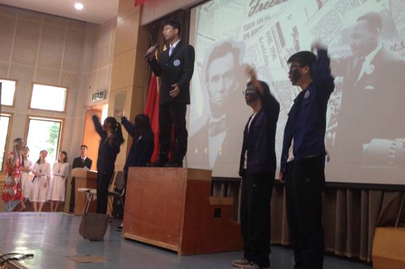 在年级诗歌朗诵比赛中,我们班抽到的主题是“Faith”,经过大家齐心协力的精心策划,一场场别开生面的历史情节被穿插在节目当中,从自由与人性将教会的闭塞与压榨的本性揭露,到黑人运动争取人权平等,我们看见的是个人命运的波澜起伏,更是历史命运的风起云涌。当然,还有班级同学对诗歌的理解,推动节目中的历史演变,更以这种方式推动着校园历史的演变。