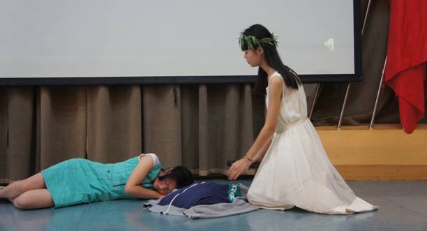 在集思广益之下,我们在表演的十五分钟之内编排了小剧场、集体大诗歌朗诵以及歌曲演唱环节。为勇气绽放的玫瑰、为勇气舞蹈的旋律、为勇气变成了超人……种种创意令我们不禁有几分胜券在握的意味。然而,美好的设想在现实面前却遇到了不小的阻碍。因为很多同学要去参加英语节排练,而恰好班级排练的又是集体的诗歌,往往只有一半的同学能到场,排练遇到了不小的挑战。在积极的沟通之下,我们终于在表演开始的前几天完成了最后的合排。最后一天戏剧之夜结束,回到班级,人们悉数离去,我们在空旷的教学楼中排练我们的歌曲与诗歌,在戏剧的鼓舞下,激情洋溢的我们完成了最完美的一次排练,给人留下了深刻的纪念。