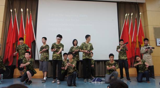 第一个出场的高一二班以一首Let it go吸引了在座观众的视线,以歌声附与诗歌,旋律歌颂勇敢之心。不同于欢快的旋律与主题,高一四班以深沉的情绪渲染了整个会厅,表现战争带来的死亡,别离和穷苦,场面震撼人心,意味深长。而最后出场的高一一班则用一个个平凡不失温馨的故事,一张张老旧却充满回忆的相片,点燃在座每一位同学心中对爱的期盼。