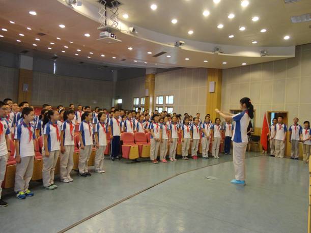 初一(1)班带来的表演“红歌串烧”告诉我们永远也不要忘了那条鲜艳的红领巾背后的意义。