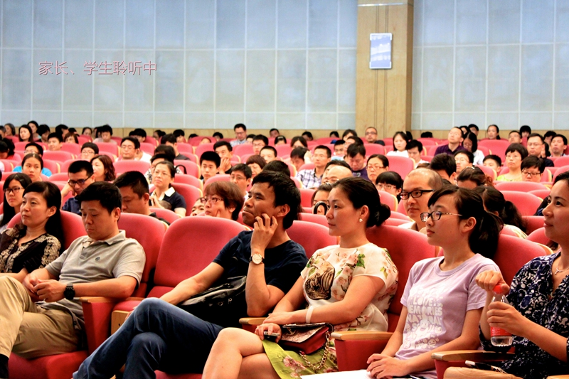 9:30全体师生汇聚在5116,举行2014级新生报到会。会议由剑桥国际高中副主任戎宏斌老师主持。首先戎老师向家长介绍了剑桥国际高中的与会领导,同时说明了整个报到后续流程和相关要求。海外升学指导负责人郭璐宁老师向全体家长分享了剑桥国际高中学生在未来三年学生要了解的升学准备内容,时间节点如何分配,同时,也向全体家长分享了全球大学排名是如何设置的,如何看待全球统一排名等等信息,让家长对海外升学的工作有了一个初步的印象和了解。随后,由剑桥国际中心学术主管谢慧萍老师发言,主题是新生怎样做好英语学习,以一种考试、两种能力、三个转变为主要线索进行了阐述,让学生和家长们对剑桥国际高中的英语学习有了概念和方向,之后,谢老师还就新生暑假作业,对家长和学生进行了解读和提醒。剑桥国际高中学生主管何诚老师随后发言,发言的主题围绕“衣、食、住、行”四大块内容展开,每一个块内容有学校目标、学校要求和给家长的建议,让家长和孩子知晓学校的总体要求,同时结合学校的要求,在日常的生活中,培养好各种各样的能力,为孩子的成长和将来出国做好充分的准备。最后,由副校长、剑桥中心主任夏谷鸣老师做发言。主要分为三部分内容,第一部分内容针对的是家长:1)要求家长适时放手,让孩子自由成长,孩子能完成的事情要让孩子独立去完成;2)家长不能过度干预学校的正常教学;3)家长要做好全方位的学习和信息获取;第二部分内容针对是学生:1)学习要努力,但是并不是事事都是“有志者事竟成”,要做到量力而行,学会取舍;2)要学会学习,好好做学习的反思,以前取得成功的方式是不是适应适合现在的学习;第三部分是针对我们中心自身:1)我们会做好外教师资队伍的稳定性工作,也会尽一切努力提高教师的水平和质量;2)我们会为学生的学习和生活提供一切基础设施的保障;3)我们努力打造杭外剑桥国际高中在国际上的知名度,做出自己的品牌。