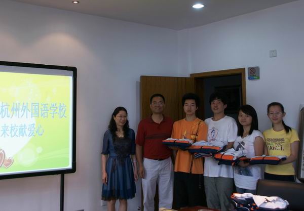 2011年6月21日下午,高中文科支部书记傅燕君老师和倪江老师带着杭外人的深情厚谊,将满满一车杭外初中学子的“退役”校服送往杭州聋人学校,缝着杭外特殊标识“HFLS”的杭外校服伴随着杭外初中学子栉沐了小和山的风雨和灵气,也凝聚着杭外人的特殊的精神风貌,当杭州聋人学校即将迎来自己的80周年校庆之际,杭外校服和杭外精神将见证这所全国知名的特教学校的历史。