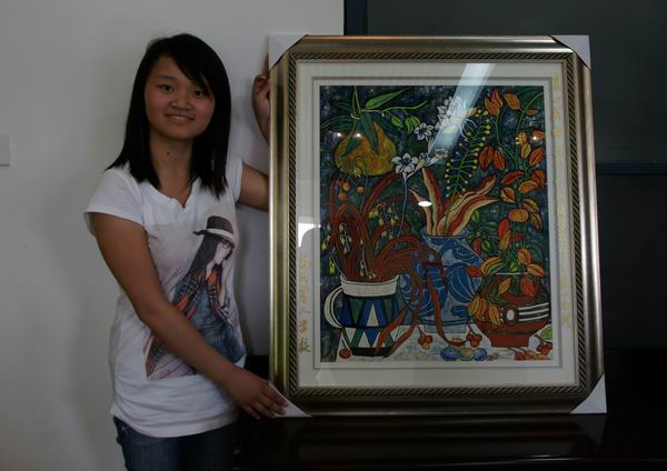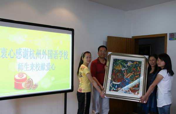 校车把500多套校服带到了处于下沙高教园区附近的杭州聋人学校,杭州聋人学校副校长和教务主任热情接待了杭外老师。在会议室,两校举行了简单而热烈的交接仪式。特别令我们感动的是,聋人学校9年级的一位女生徐晓薇花了一个月的时间作了一幅画,把对杭外师生的美好祝福都凝聚在画面上的花卉里,我们用刚学会的手语表示感谢,聋人学校同学们单纯善良而充满灵气的目光,在我们心里引起了一阵阵波澜。可惜的是由于在期末考试,志愿者协会的同学们不能亲自前往,但是,我们相信,情感的纽带已经结成,而杭外热心助残的脚步不会停止。