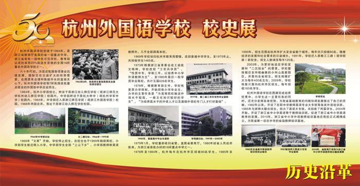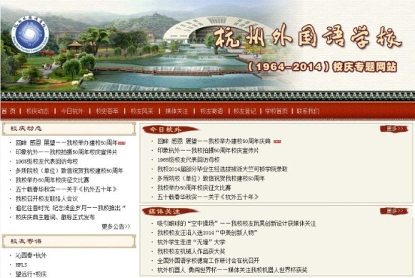 今年是杭外建校50周年。学校认真贯彻落实中央、省委、委厅关于加强作风建设的有关规定,本着节俭、务实的原则,简朴办校庆,办内涵校庆。今年年初以来,学校先后举办全国外国语学校德育工作研讨会、全国外国语学校校长峰会杭州会议,组织开展了首届校级教育教学成果评比,以总结提升办学经验、提高教育教学质量和水平。以校庆为契机,学校进一步加强与各届校友的联系,促成了校友联络会的正式成立,并通过开设校友回访讲座、开展校友寻访活动等形式,凝聚广大校友的智慧和力量,为学校发展建言献策。同时,学校充分发挥校庆的育人功能,一方面,通过创建校庆专题网站、布置校史图片展、拍摄校庆宣传片等方式,营造热烈、浓厚的校园文化氛围;另一方面,通过组织校庆主题词、徽标征集评选活动,开展校庆主题班会、征文比赛等方式,激发广大师生员工爱校、荣校的归属感、自豪感与责任感。