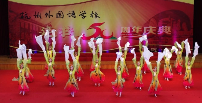 2014年10月5日,我校举行建校50周年庆典。省教育厅及相关处室、兄弟直属单位,清华大学、北京大学、浙江大学、复旦大学等全国部分重点高校,全国外国语学校工作研究会,上海外国语大学附属外国语学校、南京外国语学校、武汉外国语学校等兄弟外国语学校,杭州二中、学军中学、杭州高级中学、镇海中学等省内部分重点中学,以及杭外部分协作学校、关联单位代表受邀参加庆典。杭外各届校友近2000人回到母校,与在校师生员工一起,共襄盛举,同叙情谊。校庆庆典隆重而不铺张、节俭而不失内涵,突出校友、突出师生,达到了良好的效果。