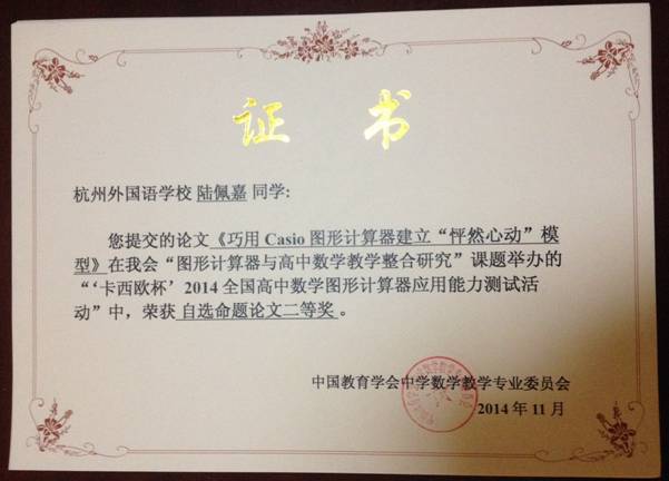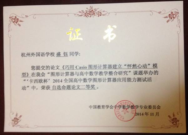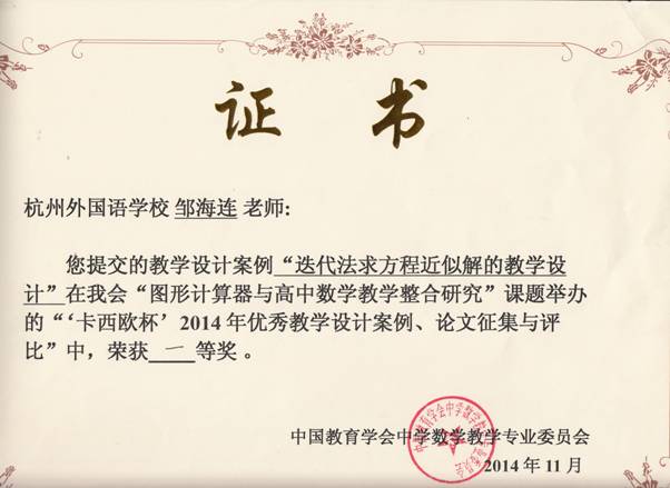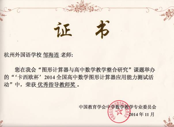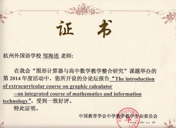 10.30至11.2期间,由中国教育学会中学数学教育委员会主办的“图形计算器与高中数学整合研究”第四次会议暨卡西欧手持技术整合研究成果观摩研讨活动在成都外国语学校举行,我校邹海连老师参加了此次会议并在分会场三中做了关于图形计算器在我校开展情况的专题报告,并且,他和其学生的多篇论文在评比中取得优异的成绩。