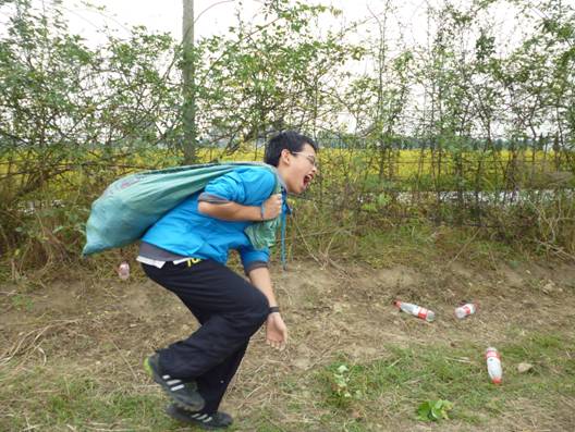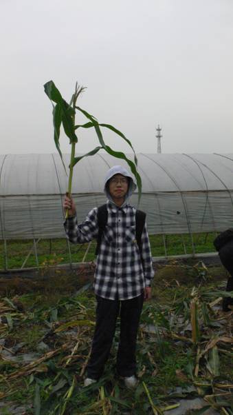 看,他们在摘玉米呢!因为大家都是新手,所以动作并不是很熟练。有的同学扯了半天硬是扯不下来,但几次之后便懂得了“一压、一拧、一拉”的六字法宝,动作迅速了很多。负责装玉米的同学,则是拎了个大袋子,左跑右跑,收集大家摘下来的玉米。快满一袋时,就用绳子将袋子扎紧,再送到“集合点”去。而负责把玉米杆子拔起来的同学,也抓住了一些技巧,先往杆子底部踩一脚,再用力一拔,一棵玉米秆子就被拔了出来。玉米地上,四十多个同学忙得满头大汗,却开心得不得了。当然,在途中也有一些“不速之客”来打扰。像小小的癞蛤蟆,总在我们身边跳来跳去,还有几只跳进了收集玉米的袋子里,引起了一场小风波。不到半个小时,原来满是玉米的玉米地,已经被我们“扫荡”完了。留下一棵棵被拔掉的玉米杆,东倒西歪地躺在玉米地上。
