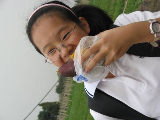 喂完小动物们,我们沿着小路往回走,走到最初的集合地时,我们还吃到了煮好的番薯和玉米,还有甘甜的甘蔗,真是笑得合不拢嘴了。再加上这些番薯、玉米都是我们自己摘的挖的,当然别有一番风味。这些东西,我们肯定已经吃过很多次,但是这次,每个人都像小馋猫,竟无一丝浪费。