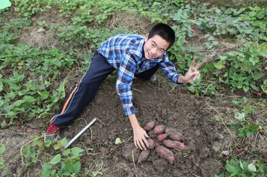 再去看看挖番薯的同学吧。他们一人拿一个锄头,卖力地挖着底下的番薯。“哇,我挖到个好大的番薯!”“这些番薯圆圆的,好可爱啊!”“我这里有很大一堆!”同学们惊喜的叫喊声不绝于耳。有些番薯很顽固,在土里硬是不让我们挖出来。一些男同学撸起袖子,用手去挖番薯,总算把它们“请”了出来。不少同学挖得手上、脸上满是泥土,却笑得灿烂。