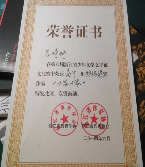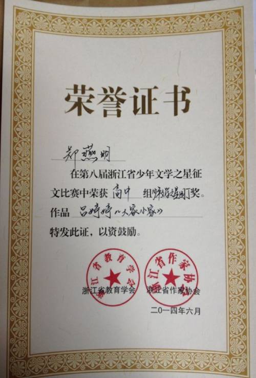 日前,由浙江省教育学会、浙江省作家协会联合主办的第八届浙江省少年文学之星征文比赛顺利落幕。全省计有20余万人参与本次大赛,经海选、初评、复评和终评,共评出“少年文学之星”奖12名(其中小学6名,初中3名,高中3名),一等奖511名(其中小学397名,初中76名,高中组38名),二等奖1025名,三等奖1532名,优秀奖2017名,团体特等奖4个。我校初、高中学生在本次征文比赛活动中,表现不俗,荣获团体特等奖,吕婷婷同学荣获“少年文学之星”奖,梁佳文、王和等15位同学荣获一等奖。