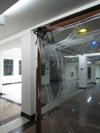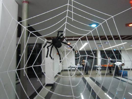 六点半,在公路上还鸣笛不断的时候,剑桥高中楼前的小竹林中已开始了鬼屋探险。两人一组跟随领路黑衣人沿着林间石子路行走,期间不时会碰到树丛中窜出的“幽灵”,脚上会突然踩到刚爆炸的炮仗,眼前会掠过白色的“蜘蛛网”,可爱的无脸鬼会捧着乔巴的帽子说“Trick or Treat”,不时传出一声尖叫划破夜空……