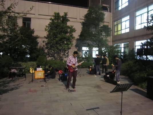 七点,两幢楼间的天井,由music club举办的音乐会激情地开场了。热舞自然少不了。最吸引人的当属帅气的鼓手、贝司手和吉他手们了,加上动听的歌声,气氛一下子high到了极点。