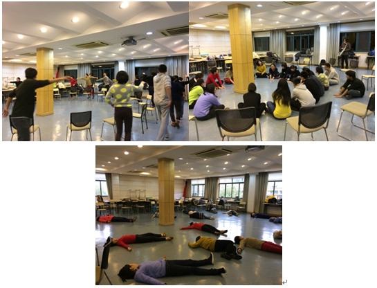 戏剧工作坊各式各样的热身活动,伴着任导悠扬的口琴声,使学生们从拘谨到放空,越来越进入表演的状态。