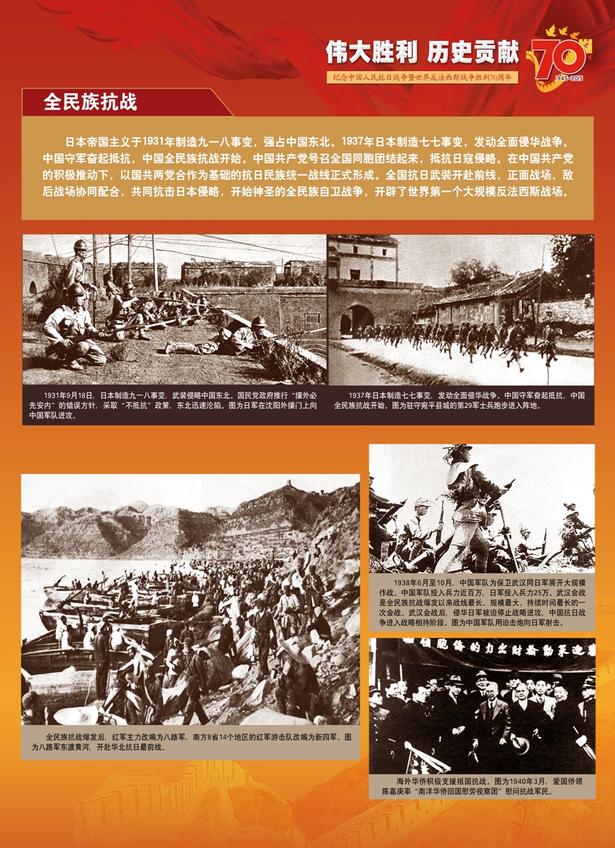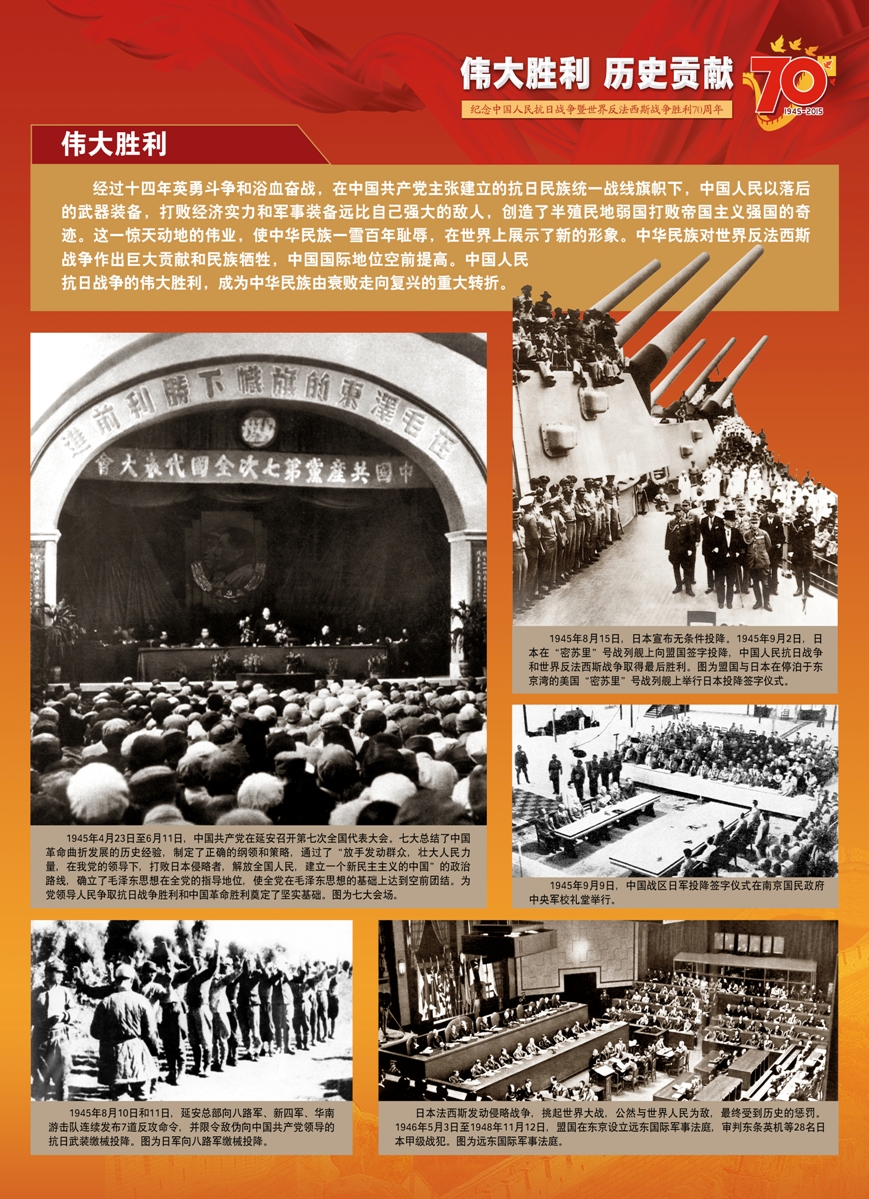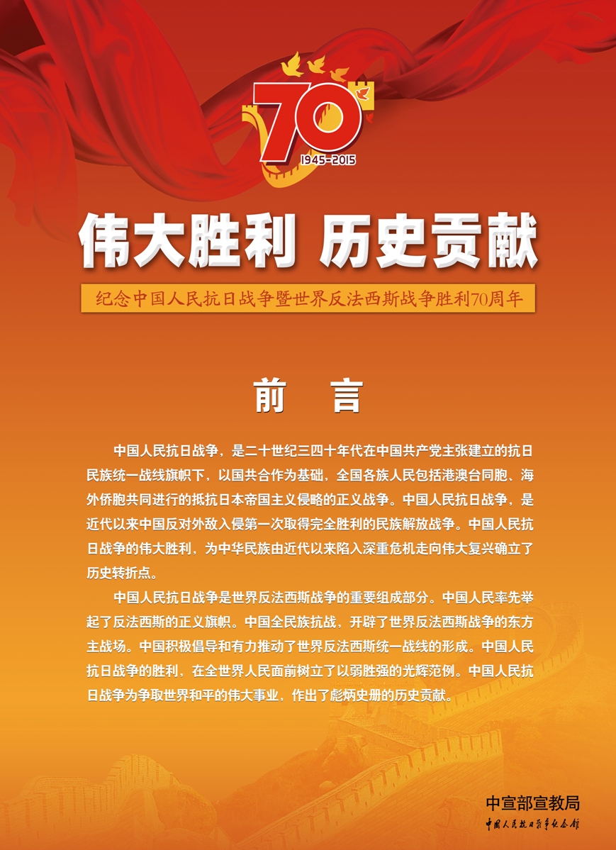 为营造纪念抗战胜利70周年浓厚社会氛围,中宣部宣教局会同中国人民战争纪念馆,以“伟大胜利 历史贡献”主题展览为基础,精选图片制作了纪念抗战胜利70周年宣传挂图。