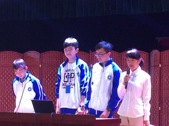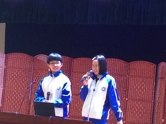 在两位主持人(徐妍、陈慧楠)简洁且开门见山的开场白中,展示活动正式拉开了帷幕。首先上场的是我们初一1班的江止善和谢扬铖同学,他们介绍的是一种美丽的工艺品——龙泉青瓷。从龙泉青瓷的感人传说一直讲到它英文名由来的有趣故事,讲到它的烧制过程、特殊的纹路以及种种分支,为我们带来了一场带着古典气息的视觉盛宴。