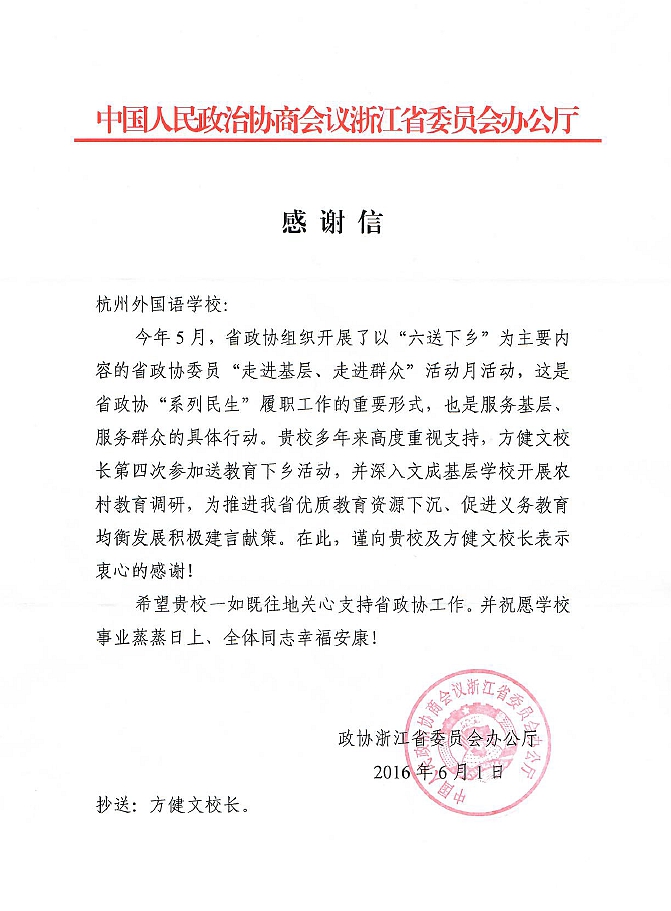 近日,省政协办公厅专门发来感谢信,对我校及方健文校长多年来高度重视、支持并积极参与省政协送教育下乡活动表示感谢。