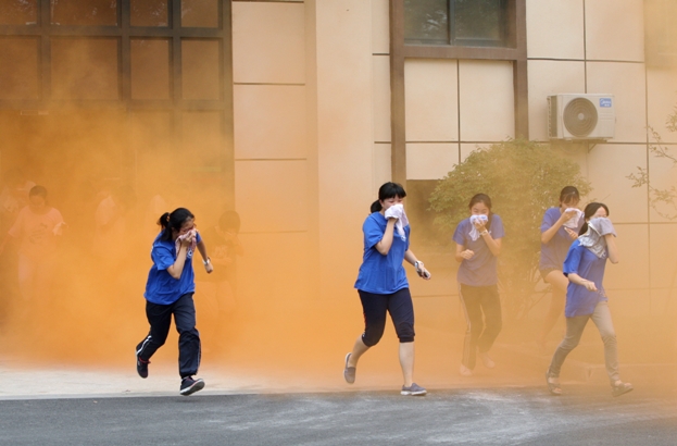 演练开始前,各班召开以“灾害应急逃生”为主题的班会课,组织观看宣传教育短片,初一年级还开展了安全教育专题讲座。“警报”拉响后,同学们迅速用湿毛巾捂住口鼻,沿最近的安全通道有序撤离,抵达指定的安全区域。随后,老师们仔细清点人数,以确认所有同学顺利撤离。