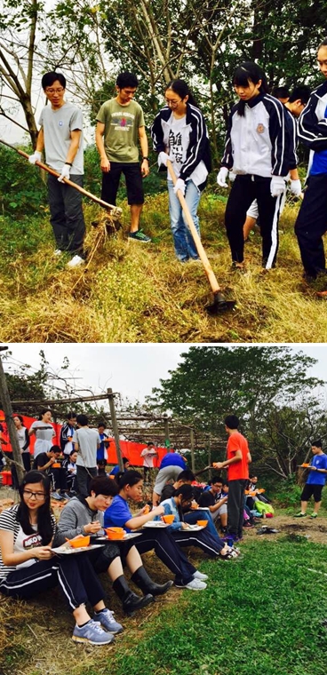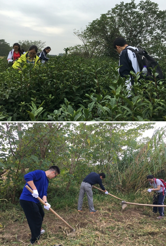 采摘完茶叶,大片的荒草地还在等着我们去开垦。换下竹篓、扛起锄头,面对成片及腰的杂草,此时一切诸如杠杆原理之类的物理定律都全然不及手中锄头的沉重以及手臂的酸疼,紧紧扎根于土壤、生命力异常旺盛的野草只能激起同学们“野火烧不尽”的恼怒。一次次弯腰下锄、休息擦汗,一次次同学间默契的轮换以及响亮的问候与鼓励,我们从这片汗与血浸润过的土地上再一次真切地体会到了集体的温暖与力量。