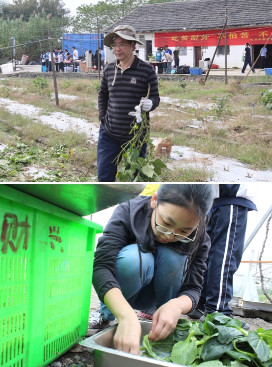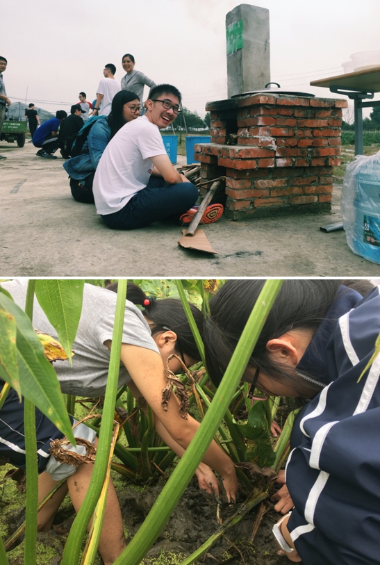 吃过了丰盛的午饭后,同学们便开始了下午的工作。第一项任务就是艰巨的挖慈菇。同学们深一脚浅一脚地进入了泥潭。没想到泥潭比想象中更险恶,不少同学与泥潭来了一个亲密接触。沾满了污泥的同学相视而笑。尽管过程很艰难,但是同学们收获颇丰,大家收获了满满的一盆慈菇。