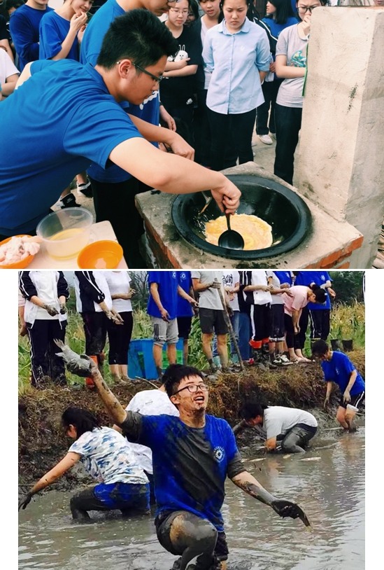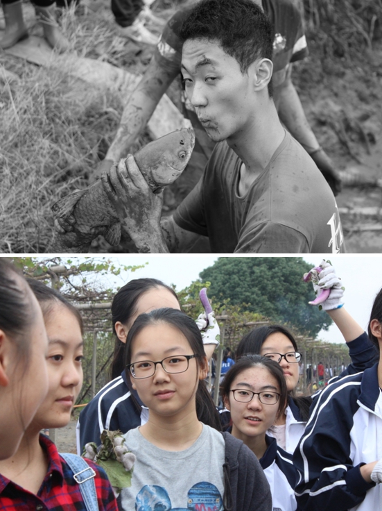 忽略淤泥湿黏的触感,探入高大的茎叶之下,带有细长头尾的球状茨菰往往在不经意间就被发现;收获若干战果后,大家转战鱼塘,与及腰的淤泥继续作斗争。面对穿行游动的活物以及亲手收获晚餐的无上诱惑,同学们奋不顾身、自毁形象地进入鱼塘,在泥水之间体验了一把真正的“浑水摸鱼”。
