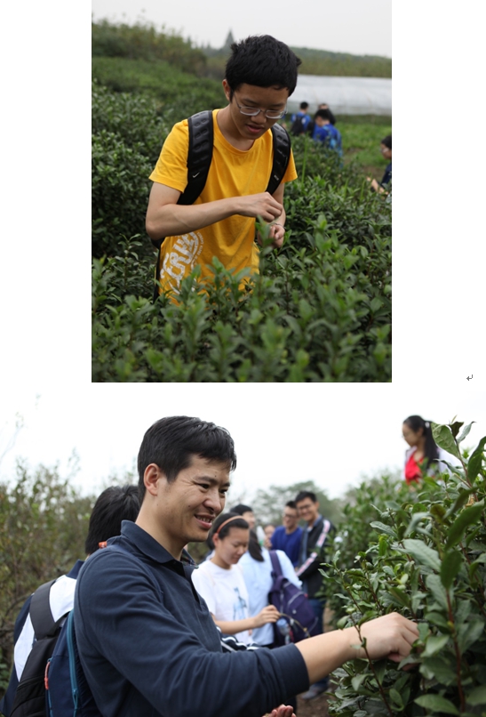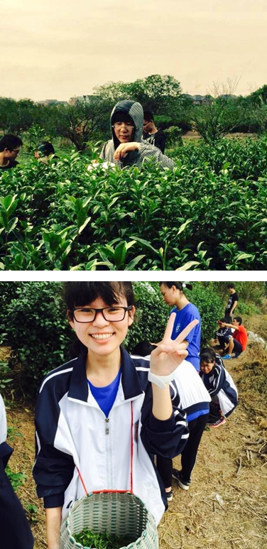在攻克了南瓜藤地后,同学们走向下一个挑战地点:采茶叶。阳光终于透过云层洒在大片的茶树上,同学们提着小筐在茶树间寻找标准茶叶—两叶一心。颇有种“采菊东篱下,悠然见南山”的安逸感。同学们一边唱着“采茶叶的小姑娘”一边辛勤地工作着。同学们为了互相鼓励,按照分组分成了两组进行了激烈的竞争。最后以“leader”组胜利结束。很快,小小的茶叶筐里装满了绿嫩的小茶叶。