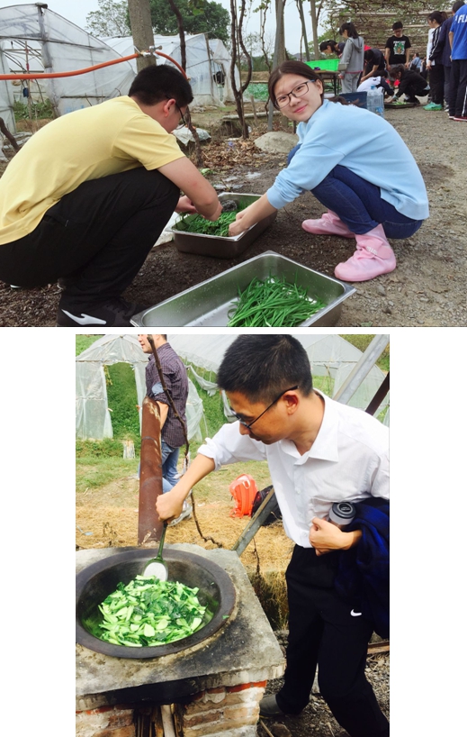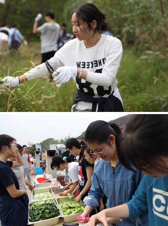 但是一旦实施起来就发现,似乎整个学农过程中最艰辛,也最令人期待的事情就是同学自己做饭这件事情了。如果说自己给自己做饭还可以马虎了事的话,面对全班同学满怀期待的眼神时,似乎掌勺的同学在往锅里撒盐的时候手都有些颤抖,生怕自己的一点差错毁了同学们寄予厚望的晚餐。其实很多同学在家里也有过做饭的经历,但是大锅饭是很不一样的,对于准备时菜量的把控,对于下锅时油盐酱料的度量,虽然大锅饭更加不讲究色香味俱全,但是做饭的同学似乎都更有了失之毫厘差之千里的谨慎感。这份谨慎或许来源于对砸了自己大厨招牌的恐慌,但或许更多的是源于对自己辛勤工作了一天的同学们的责任感。
