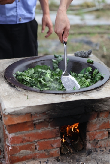 做饭这个任务在同学们亲身体验过之前显得实在过于简单,极具挑战精神的六班同学似乎都宁愿挽起裤脚下河抓鱼或者扛把锄头清理田地,也不愿意待在固定的大灶旁做洗菜洗盘子,切菜掌勺这一些看起来特别婆婆妈妈的事情。