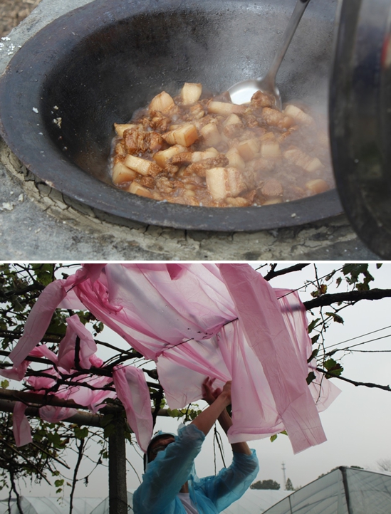 午餐是我们y1a的方大厨掌勺,当所有人都从黄瓜地里归来,都被色香具全的红烧肉所惊喜,就像未有期待,才会被幸福感所感染。手中的,单薄的锅勺在翻炒着,跃动着,残留着酱与油,慢慢地流下,又再随着翻转溯游。我们就站在锅的对面,偶尔也彼此四目相对,流露只有触动。