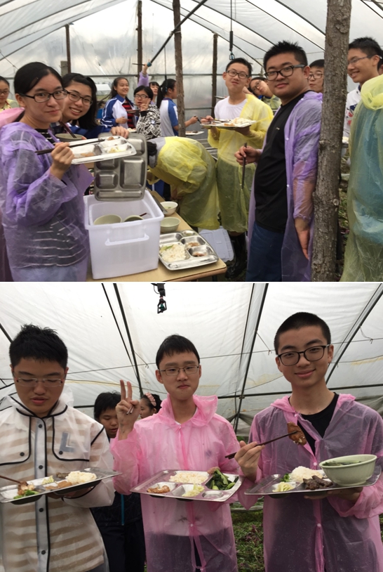 天公不作美,在解决了水的问题的时候,万万没有想到,雨也来了。无奈之下,我们只好把晚餐地点改到了大棚下,撑着雨伞烧完了最后几道菜。都说阴雨天气会影响人们的心情,我看未必。同学们的脸上都挂满了幸福的笑容,丝毫没有被这阴雨天影响。