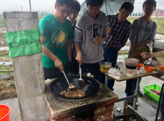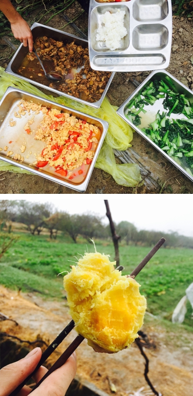 在其他小伙伴挖番薯摘玉米的同时,炊事班的同学们同样有繁重的任务,我和几个女生需要清洗一大筐的青菜,菜叶相当原生态,上面有不少虫啃过的洞和黑蓝色的小瓢虫,另外几个人则开始淘米,乳白色的淘米水又被用来洗菜,当大箩筐终于见底的时候我们也总算能停下手中机械化的工作了。大家花了很长的时间把一整只鸡剁碎、洗净,裹上盐粒和酱油,此时负责生火的同学也成功了,一点白烟袅袅升起在烟雨疏林里,别有一番“迟迟朝日上,炊烟出林梢”的韵味。油锅炸开后,红烧鸡肉开始呈现出一种好看的色泽,锅面上浮起一层冒着热气的油。紧接着韭菜炒蛋、红烧冬瓜都出锅了,同学们摘来的甜玉米和番薯也煮好了,大家不顾食物的滚烫迫不及待地品尝了起来,清甜的玉米味让味蕾得到了极大的满足。