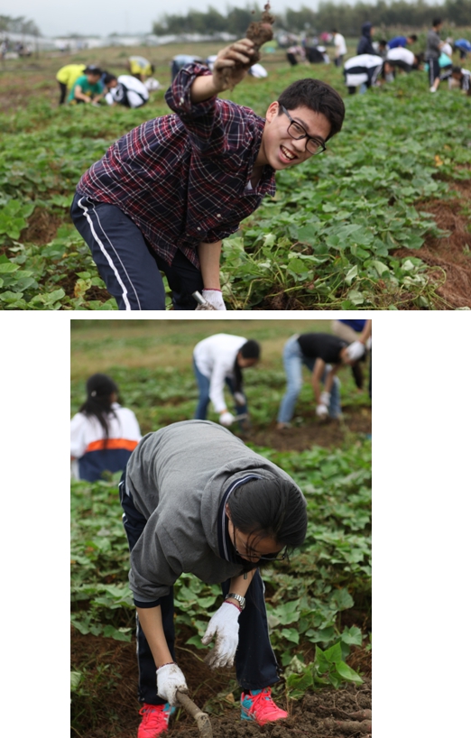 当班里4个男生合力拎着两大袋番薯走回场地时,炊事班早已烧好了中餐。经过前一天的训练,大家显然都有了经验,火候掌握得很好,菜也比之前入味,更赞的是炊事班很细心地在菜式上作了一些改变,青菜汤里多了香肠,鸡肉里也加了很多调料......为劳累了一天的同学补充了体力,也为两天的学农活动做了一个完美的收尾。