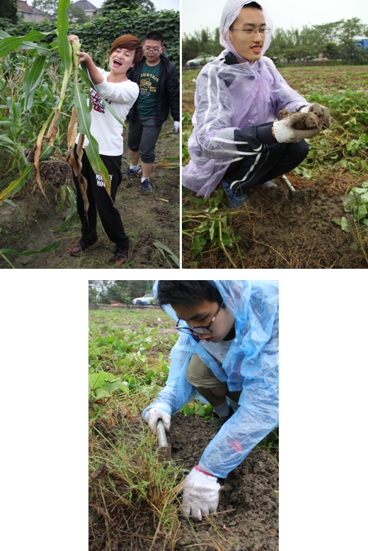 谁知道这游戏还有炼狱难度。掰完玉米后上级传来消息说向番薯地进军,面对藤蔓满布的田,拿着小锄头的我们有点不知所措。经过倪老师和老师傅的指导之后,大家开始了工作,渐渐的,脚底积起一层厚厚的泥垫,足足有五双鞋的重量。在挖番薯的过程中我们才真正体会到了什么叫做与大自然融为一体,因为这就像我们已经深深的扎根在土里了。