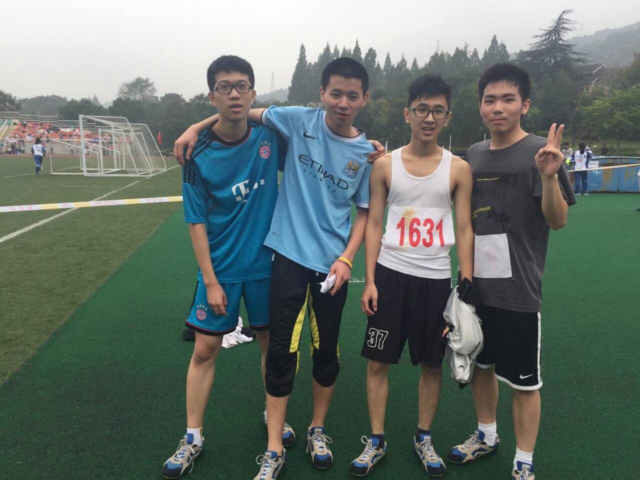 A2:我们并没有完整的练过一遍,交接棒也没练过,因为4×400对交接棒的要求没有4×100那么精准。而且在之前的200m比赛中顾庸代同学受伤了,我们临时换成李林岳同学。但是李林岳等下还有3000m的比赛,所以他真的很辛苦,他的体力很好。他长跑确实很厉害。同时,我们也应该感谢顾庸代吧,他之前也为我们班付出很多,在100和200的比赛中,而且一直在帮助我们训练。