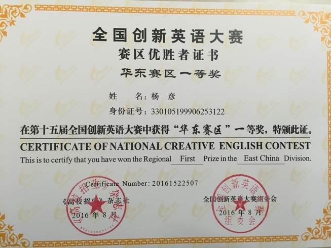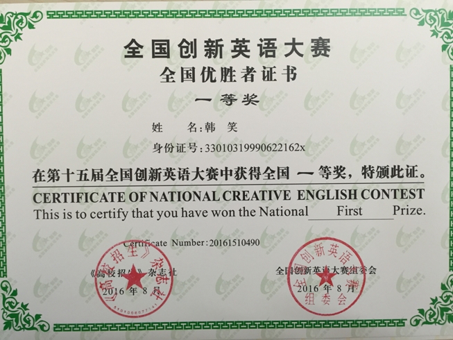 我校学生荣获全国创新英语大赛一等奖