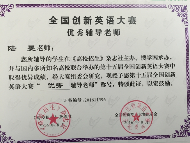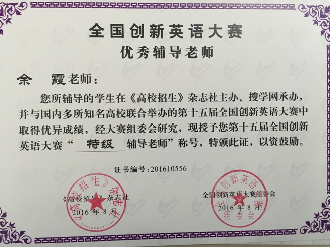 今年五月,我校高三(1)班韩笑和高三(4)班杨彦同学参加了第十五届全国创新英语大赛。最终,韩笑同学荣获全国一等奖,杨彦同学获得华东赛区一等奖。同时,余霞老师和陆旻老师分别获得“特级辅导教师”和“优秀辅导教师”的称号。