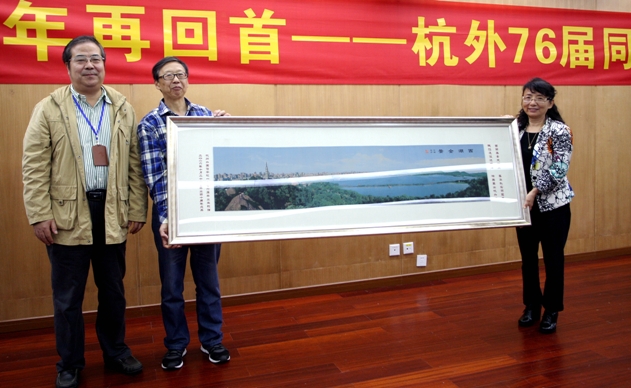 76届校友向母校赠送了一幅织锦,上面绣有“西湖美景天下闻,春华秋实雨露恩。钱江逐浪达四洋,精英辈出杭外门”的诗句,深切表达了对母校的感恩之心、报答之情,以及希望母校越办越好的美好祝福。