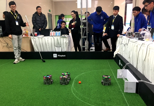 12月11日下午,技术挑战赛点球大战。我校守门员机器人采取左右摇摆的截球方式,多次扑出对方点球。在激烈对抗后,我校足球队赢得冠军。