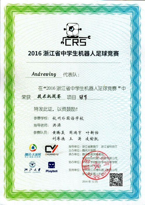 2016年12月9日-11日,我校机器人足球队参加了浙江省中学生第二届机器人足球竞赛,最终荣获技术挑战赛(点球大战)冠军。