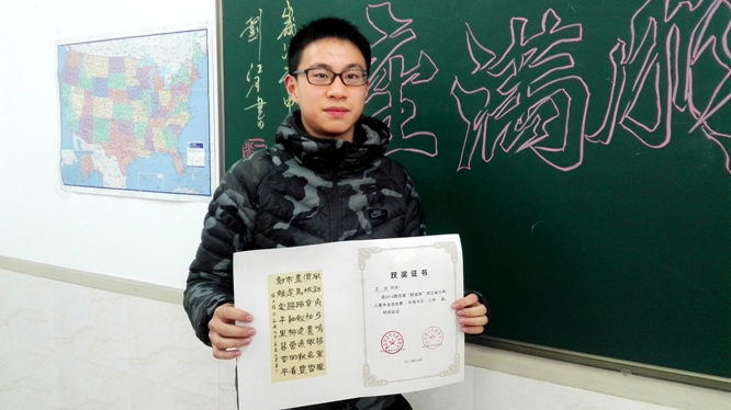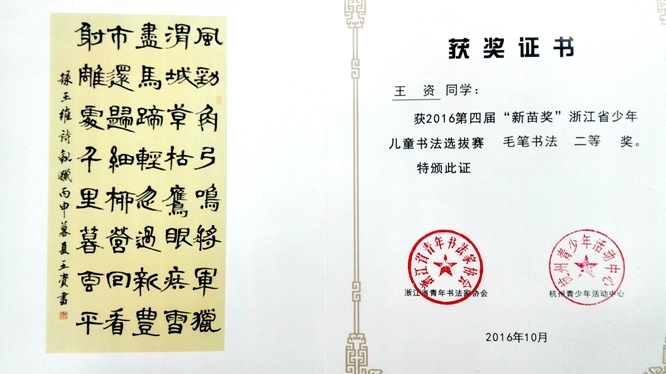 由浙江省青年书法家协会和杭州青少年活动中心联合主办的2016第四届“新苗奖”浙江省少年儿童书法选拔赛于日前完成终评,我校王资同学在刘江锋老师的指导下,荣获毛笔书法二等奖。