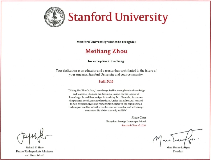 由我校2016届毕业生、今年刚刚入读斯坦福大学的陈昔诺同学推荐,斯坦福大学向我校周美良老师颁发了一份荣誉证书,以此表彰他作为一名教育者和引导者,为陈昔诺同学的未来发展予以的强有力支持,也感谢我校为斯坦福大学培养了如此优秀的学生。该证书由斯坦福大学校长Marc Tessier-Lavigne和本科生招生主任Richard H. Shaw亲笔签署。