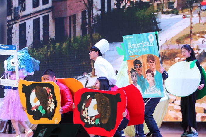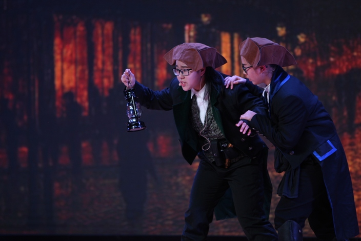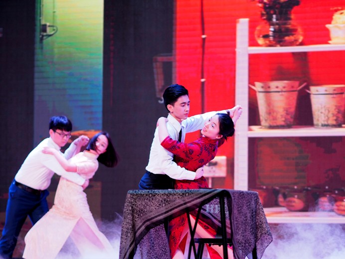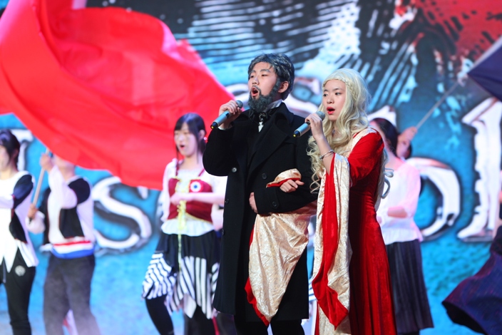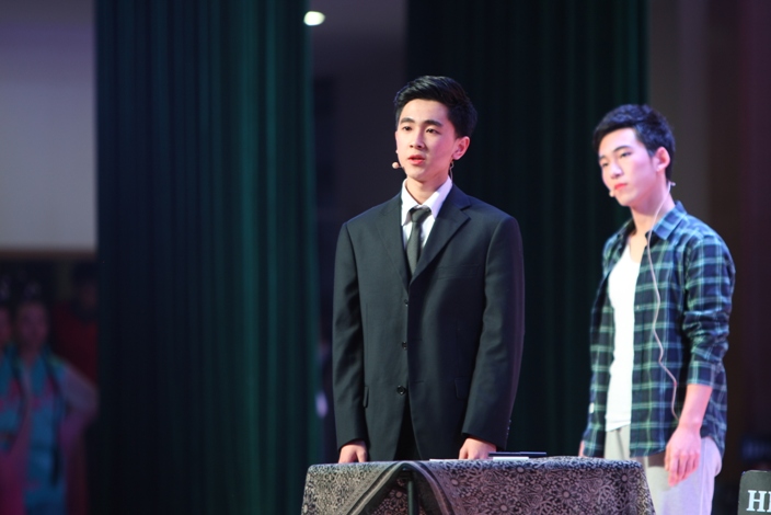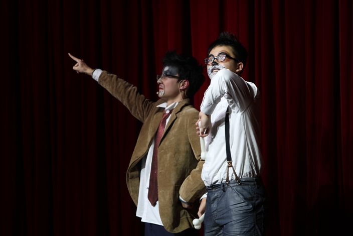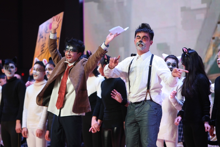 晚会的舞台剧表演更是让观众眼前一亮。话剧社带来的韵剧《新生》别具一格,首先赢得了阵阵喝彩。高二年级的《来福和旺财的生活启示录》,在诙谐生动的表演背后,流露出同学们对学校的热爱和对老校区的眷恋之情。高三中法班和APU的节目《2046青年旅社》也深深吸引了观众的目光,精美的场景布置,有悬念的情节设置,尤其是其中的粤语台词获得了大家的关注。老师们的节目向来人气最高,语文组老师们带来的《和山谐奏曲》,包含演唱、朗诵和短剧等多种艺术形式,不仅让同学们大饱眼福,也使我们看到了老师们可亲可爱的一面。