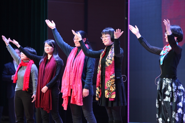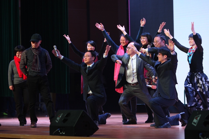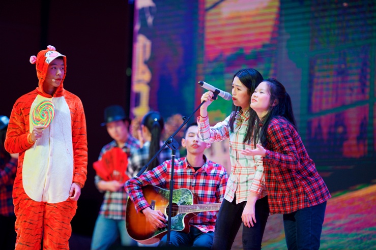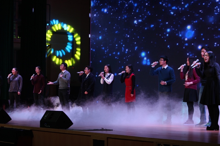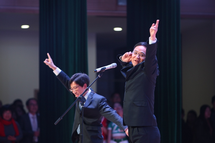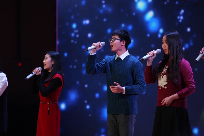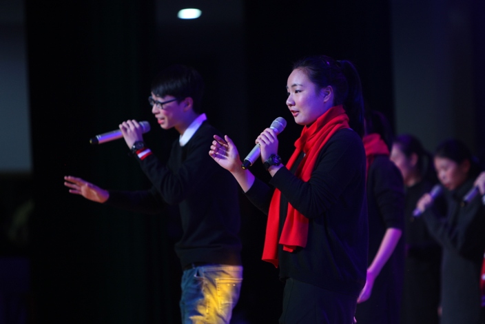 歌唱节目为本次演出添了浓墨重彩的一笔。一开始,格子音乐社带来的燃情演唱,使礼堂内的气氛迅速升温。相较之下,合唱团的《梨花又开放》显得温婉柔和,三声部的配合堪称完美。阿卡贝拉组合带来的《Price tag》《Lollipop》《We are young》三首歌曲串烧,高亢与低沉相得益彰,给观众带来了不一样的听觉享受。离退休教师代表的小组唱,唱出了对祖国的热爱,更唱出了对新一代杭外人的关爱与期许。