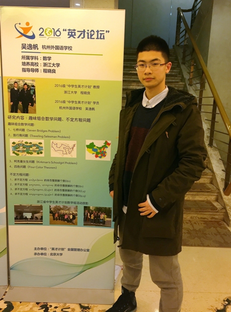 2016年12月底,我校高二年级吴逸帆同学代表浙江省中学生英才计划数学学科学员,参加了由“英才计划”全国管理办公室主办、北京大学承办的2016“英才论坛”。在此次活动中,吴逸帆同学结合自己研究的一类不定方程的非负整数解问题,向出席活动的专家、老师和同学们汇报了自己一年来的学习成果,得到了大家的一致好评,被评为优秀,同时获得参加2017年中国科协青少年国际科技交流项目遴选培训暨 Intel ISEF冬令营资格。