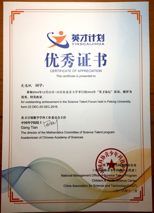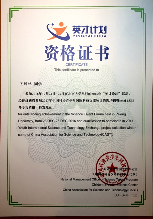 在本次2016“英才论坛”中我很荣幸能得到教授们的肯定且被评为优秀,还一并获得了参加2017年中国科协青少年国际科技交流项目遴选培训暨 Intel ISEF冬令营资格。最后颁奖的时候听到自己的名字时也非常意外,能在那么多优秀的同学之中脱颖而出不仅仅是自己努力的结果,更离不开我的导师——浙江大学程晓良教授的悉心指点。
