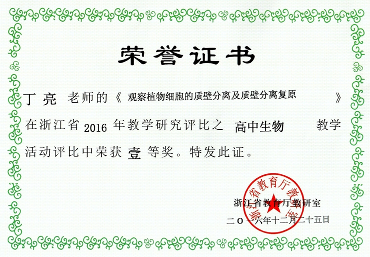 在丽水市龙泉第一中学举行的浙江省2016年高中生物教学活动评比中,我校丁亮老师展示了《观察植物细胞的质壁分离及质壁分离复原》的教学设计和过程,喜获一等奖。