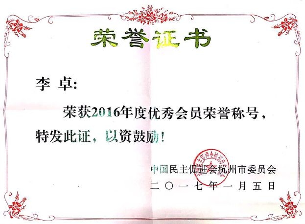 我校英文组李卓老师作为中国民主促进会会员,在做好本职工作之余,积极参政议政,热心社会公益,被中国民主促进会杭州市委员会评为2016年度优秀会员。