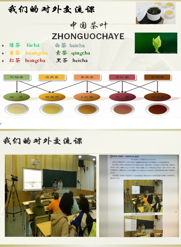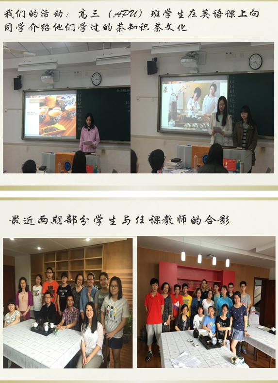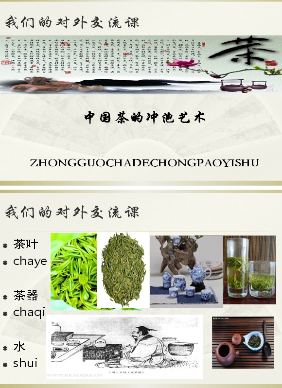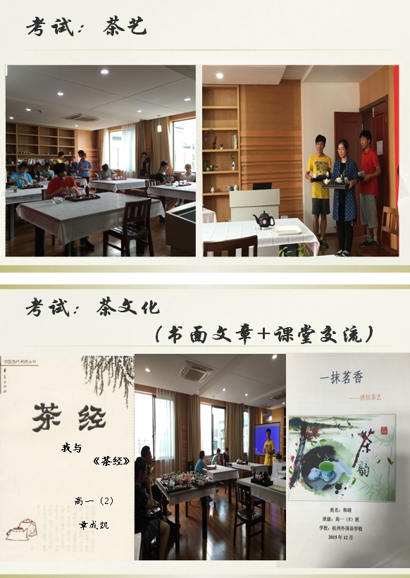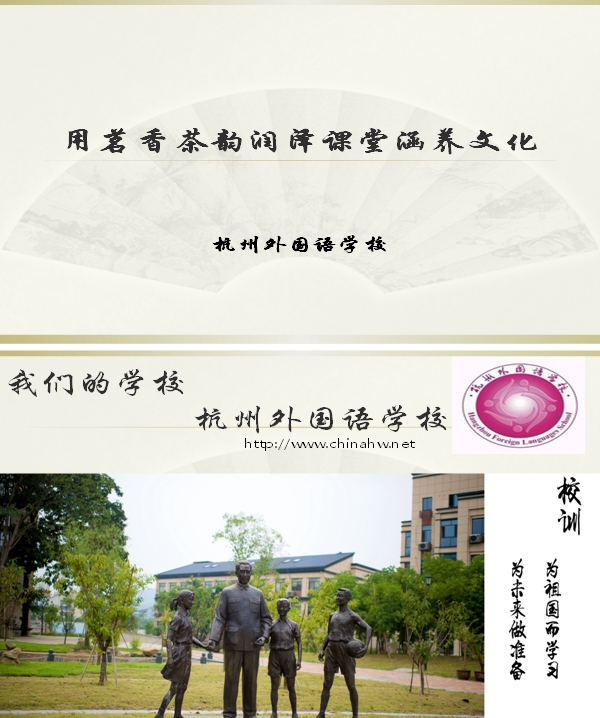我们杭州外国语学校是一所六年一贯制的省重点中学,因为有着鲜明的外语特色,于是便有了“浙江省特色示范学校”的称号。因为“外语”这个特色,我们的学生有机会接触更多的他国文化,拥有了更多的国际交流机会,多元文化的学习,使他们思想更开放更包容。我们希望他们在学习他国文化的过程中,首先了解我们自己国家的文化,我们传承了数千年成为了我们中华民族精神DNA的文化。因此,我们学校对学生的培养目标中有一条是:培养具有国际视野的中国人。我们将此培养目标不仅融入我们的课堂教学中,还渗透到课外各类活动中。对传统历史文化的学习、对民情风俗的了解都成为了学生乐为之事。我们通过教师开设选修课、聘请专家讲座为学生学习中国文化提供了更多机会,学生也自发通过社团活动与课程学习交流诸如历史、书法、绘画、戏曲、武术等中华民族文化之精粹,并将中国文化运用到与国际学生互访活动中。“民族的才是国际的”理念成了师生的共识,中国传统文化的传承与传播在我们学校成了大家自觉的行为。但茶文化进入我校课堂与活动的时间,远比其它的文化形式迟得多。