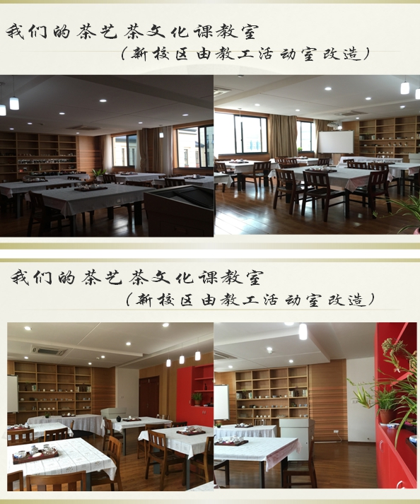 去年,我们学校加入了“学校茶文化与健康联盟”,“茶文化进校园”的倡导,进一步推动了我们学校的茶艺茶文化教学发展。学校领导也非常重视这项工作,由于学校搬迁面积减小,在教室极度紧张的情况下,校长亲自与工会协调,将教工活动室改成茶艺茶文化专用教室,虽然与其它学校的茶艺教室相比,我们的教师还是简陋的,但这教室经过我们任课教师的改造布置,也有其独特的味道。