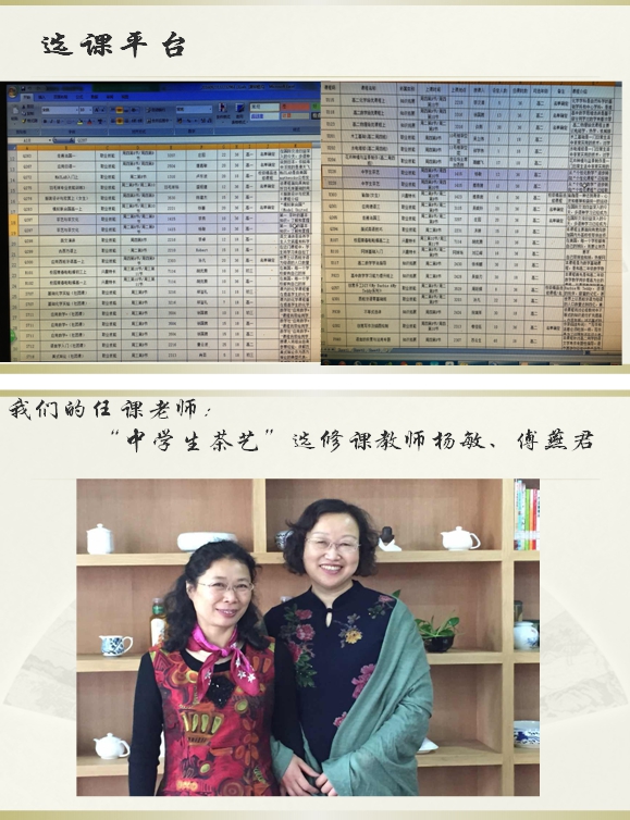 恰好在2012年的下半年新一轮课改开始实施,选修课正式进入中学课堂。那一学期结束时,《中学生茶艺》与《中国茶知识与茶文化》分别以职业技能类、兴趣特长类校本选修课的形式出现在学校教务处的选修课申报单上。茶艺、茶文化借着新课改的契机进入了我们学校的选修课抢课平台,那是2013年的上半年。我们学校的杨敏、傅燕君、李燕三位教师成为了这两门选修课的任课教师,这三位教师喜爱中国茶,在前期都已自费参加了校外专业的茶艺茶文化培训。杨敏、傅燕君老师先后获得了中、高级茶艺师的资格证书,她们合作开设了《中学生茶艺》课程,李燕老师在社团精品课程的基础上开设了《中国茶知识与茶文化》。课程开设之初没有专用教室,我们动手改造了英语小教室和学生活动室,因陋就简,我们把英语小教室的双人课桌用一张塑料茶布覆盖后当成茶桌,我们和学生一起在校后勤服务公司工作人员的帮助下,挑选购置了简单且价廉的茶具茶器,许多茶叶以及部分茶器甚至是老师与学生从家里拿来贡献给大家的。条件虽然简陋,但是师生教与学的热情不减。一学期下来,“中学生茶艺”的选修学生学会了辨析六大类茶中的特色名茶以及红茶、绿茶、花茶、乌龙茶的不同冲泡技艺;“中国茶知识与茶文化”的选修学生,学习中国茶的分布、种类、特性、茶与健康的关系等知识,学会红茶、绿茶不同的冲泡技艺,了解茶的栽种、饮用、商贸发展的历史,理解与儒释道哲学思想交融形成的独特的中国茶道精神以及茶文化在国内外的传播与影响……第一个学期结束考试时,茶艺班学生有模有样的茶艺表演场景,茶文化班学生“我与茶的故事”交流情形,至今都留在我们教师的记忆里,感动着我们。